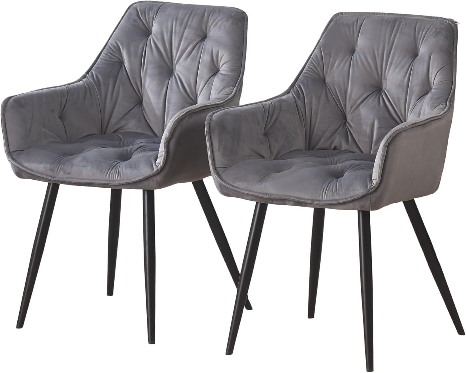 Set of 2 Grey Velvet Armchairs with Black Metal Legs for Modern Dining or Office