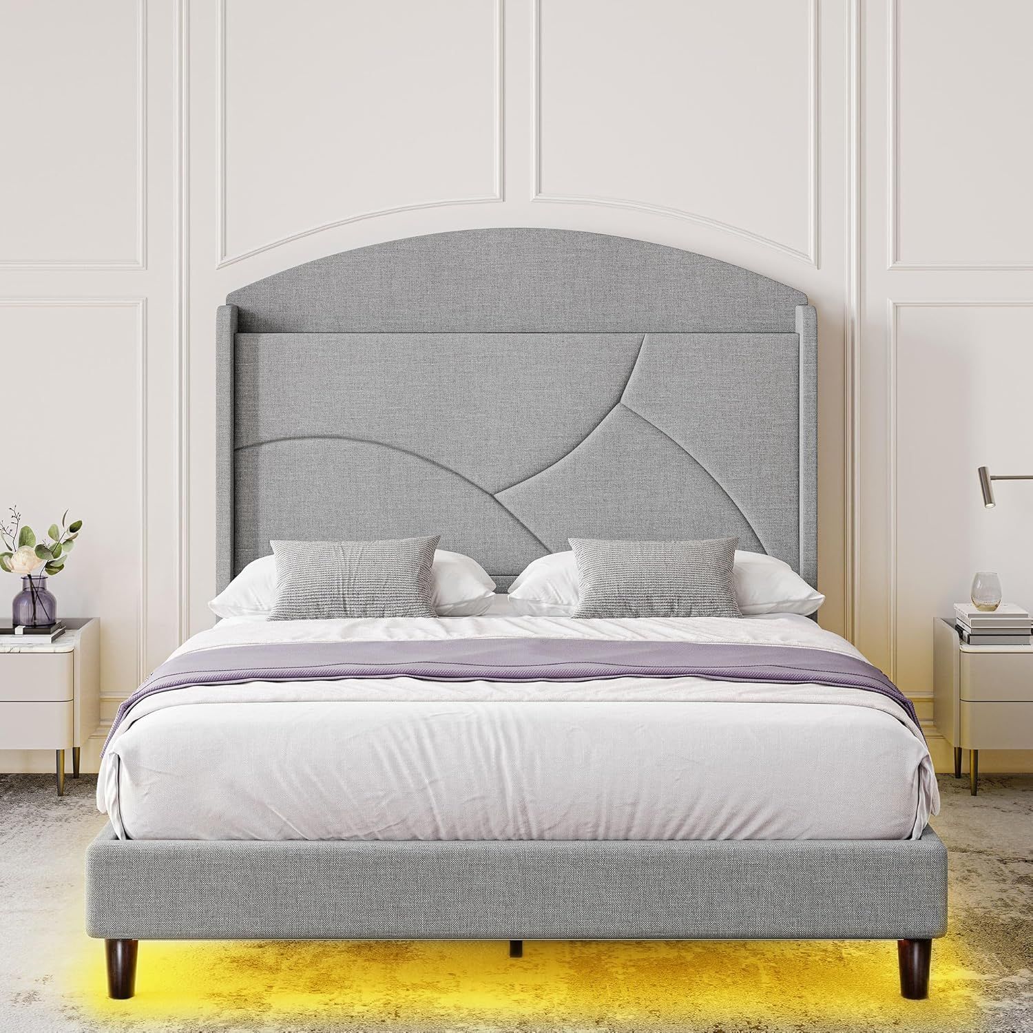 BELLEZE Queen Bed Frame with USB & Type-C Ports, Wingback Storage Headboard, LED Light, Upholstered Platform, No Box Spring