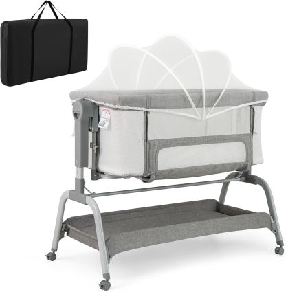 4-in-1 Baby Bassinet with Rocking Feature, Adjustable Height & Mosquito Net - Portable Travel Crib in Light Grey