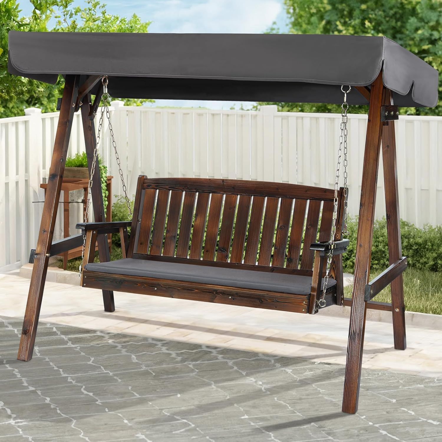 Alfordson 3-Seater Outdoor Swing Bench with Adjustable Canopy and Wooden Armrests