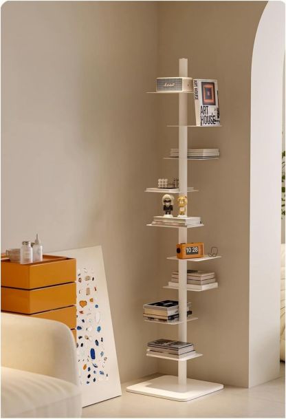 The wide base of the bookshelf provides stability and safety. Designed with a 9-tier spine, it fits well in tight spaces, making it suitable for areas like study rooms, living rooms, and bedrooms. This metal bookshelf can accommodate up to 100 books, helping to keep your space tidy. The vertical bookshelf tower is straightforward to assemble without tools, offering an enjoyable DIY experience.