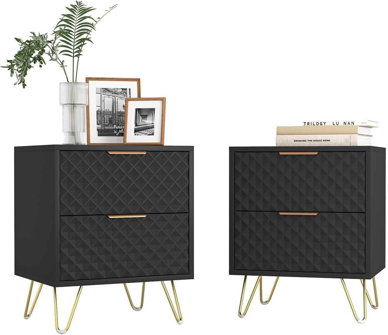 [Diamond-shaped Finish] These night stands feature a diamond-shaped finish with a high-tech painting process and come with gold handles and legs, adding a touch to your bedroom decor. The detailing on the surface enhances the overall aesthetic appeal. [Sturdy Use] Made from MDF and supported by 4 gold metal legs with anti-slip and anti-scratch pads, ensuring durability and stability for your bedside lamp, alarm clock. [Storage Space] Measures 13.78"D x 16.5"W x 20"H. This set of 2 night stands comes with 2 storage drawers for books, glasses, medicines, or personal essentials, promoting an organised environment. [Home Décor] This bedroom side table adds a chic feeling to your home. The combination of black/white and gold offers simplicity to your space. [Easy Assembly] It includes clear instructions and necessary accessories and tools for easy assembly.