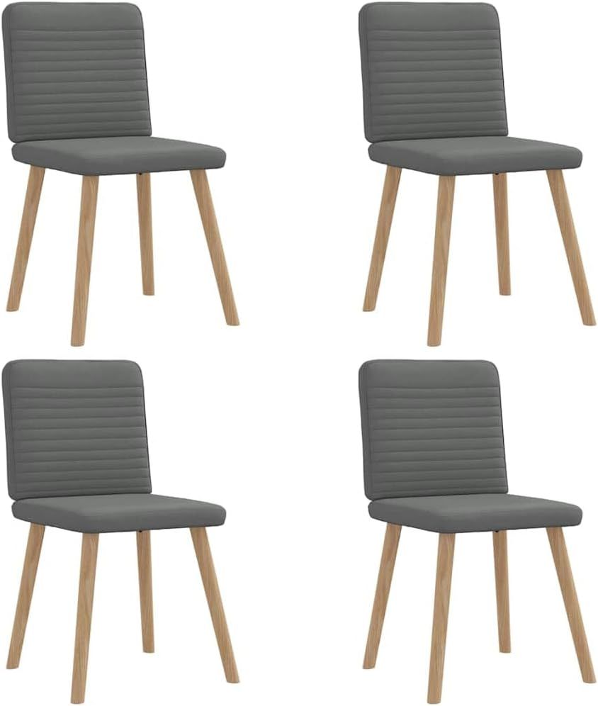 Colour: Dark greyMaterial: Fabric (100% polyester), plywood, metal, solid rubber woodFilling material: FoamOverall dimensions: 45 x 54 x 86 cm (W x D x H)Seat size: 45 x 41.5 cm (W x D)Seat height from the ground: 47.5 cmBackrest height: 39.5 cmMaximum weight capacity (per seat): 110 kgAssembly required: YesIncludes: 4 x Dining chair
