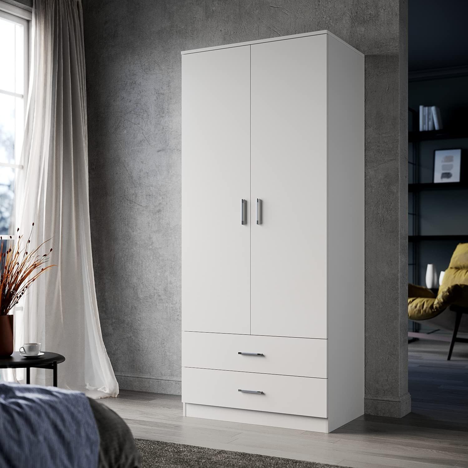 [PRODUCT SIZE] The wardrobe measures 180(H) x 50(D) x 77(L) cm and features a white finish. [QUALITY MATERIALS] Constructed from particle board and MDF with melamine, it's designed for easy maintenance and cleaning. [STORAGE SPACE] Includes a large hanging area and two storage drawers, providing organised space usage. The bottom drawer offers extra storage and privacy. [DESIGN] A simple design that complements various room settings. Suitable for the bedroom, bathroom, living room, or lounge room for organising your belongings. [INSTALLATION] Flat-packed with self-assembly instructions. [Warning] Includes anti-toppling devices for added stability and security.